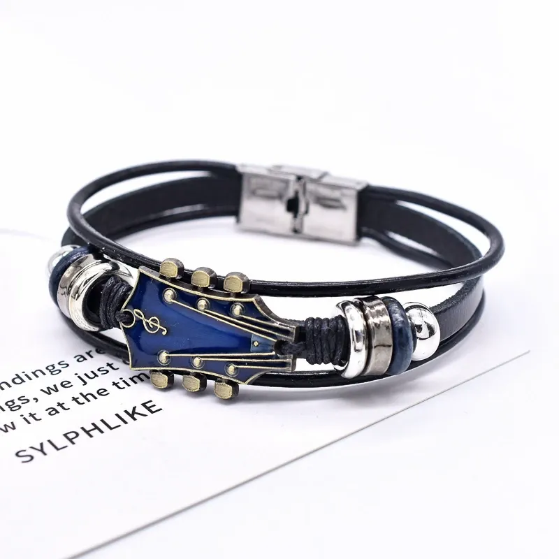 Music guitar genuine leather bracelet, oil-dropping stainless steel buckle woven leather bracelet(Gift box not included!)