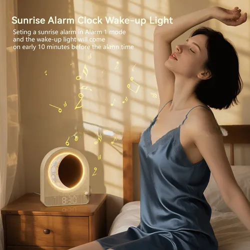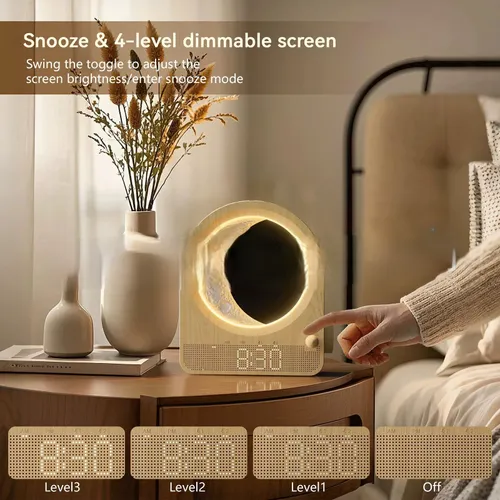 New Woodgrain Touch Night Light Clock - Alarm with Natural Sounds, Moon & Meteor Projection, Eye-Care Bedside Lamp