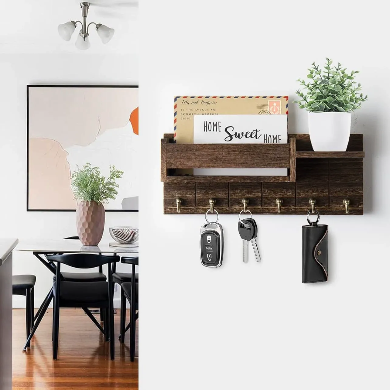 Wooden Wall-Mounted Organizer - Mail & Key Holder with Hooks for Bedroom, Study - Solid Wood Wall Shelf