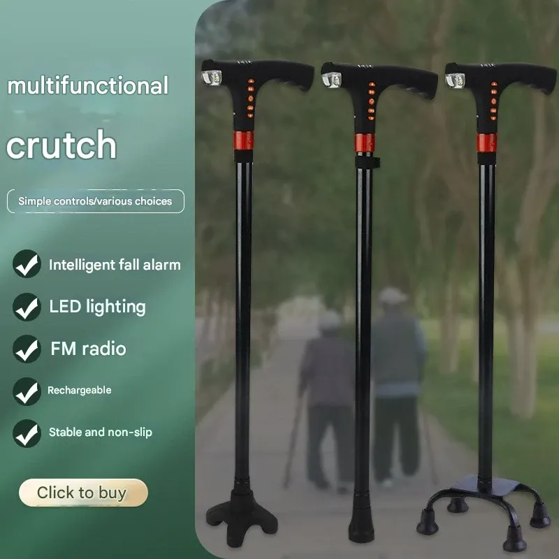 Multi-functional Elderly Walking Cane with LED Lighting, Alarm, Radio, and Telescopic Smart Design for Outdoor Hiking and Mountaineering